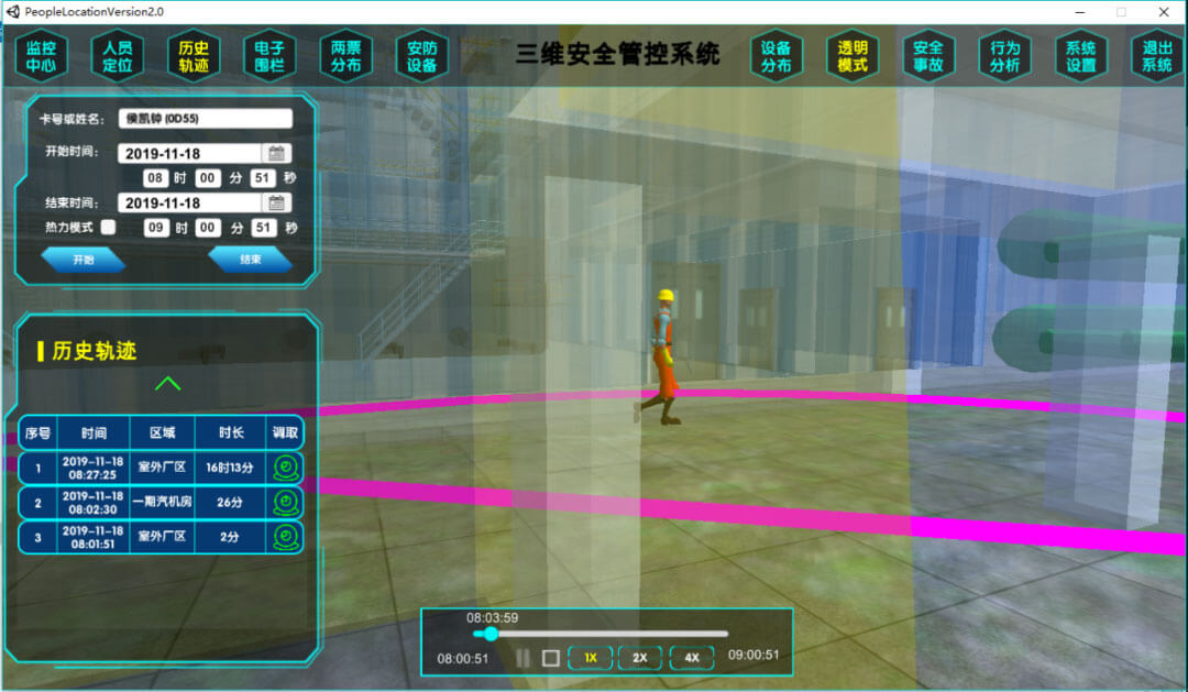 通過單人、多人以及熱力圖模式對歷史軌跡進行查詢。多維度數據及查看方式方便變電站管理人員對位置歷史數據進行有效分析和利用。