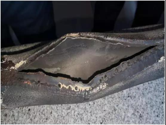 經過檢查后發現,造成本次事故的原因是過熱器爆管。流過熱器低溫段左側第二屏前向后數第三根管爆管,爆口距頂棚約4米,爆口外表面有長約200mm、寬約10mm溝痕,厚度1mm溝痕,斷口大部分壁厚小于1毫米。斷管后進行通球未發現異物,調取2018年10月9日1號機組啟動以來壁溫及煙溫曲線,未發現超溫情況,該管段附近無吹灰器(排除吹灰器吹損原因)。由于管子爆口下部管段存在明顯減薄缺陷,且原因不清,為進一步分析查明爆管及管子減薄缺陷的形成原因,2月18日,將爆管管樣寄至熱工院進行檢測分析。